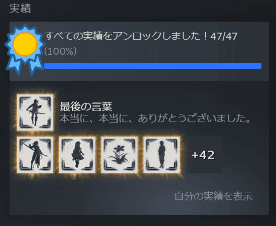 先月末に発売されたNieR Replicant ver.1.22474487139...[^1]を買いまして、一ヶ月弱ほどで実績を全て達成させられました。最初の方はほかのゲームと平行しつつのんびりとプレイしていたのですが周回を重ねてシナリオの核心に近付くにつれて続きが非常に気になってしまいここ数日はずっとNieR Replicantのことばかり考えていました。副業を始めたばかりであったり本業もちょうど忙しくなっていたタイミングではあったのですが睡眠時間や個人的な勉強の時間を犠牲にすることによって解決しました。